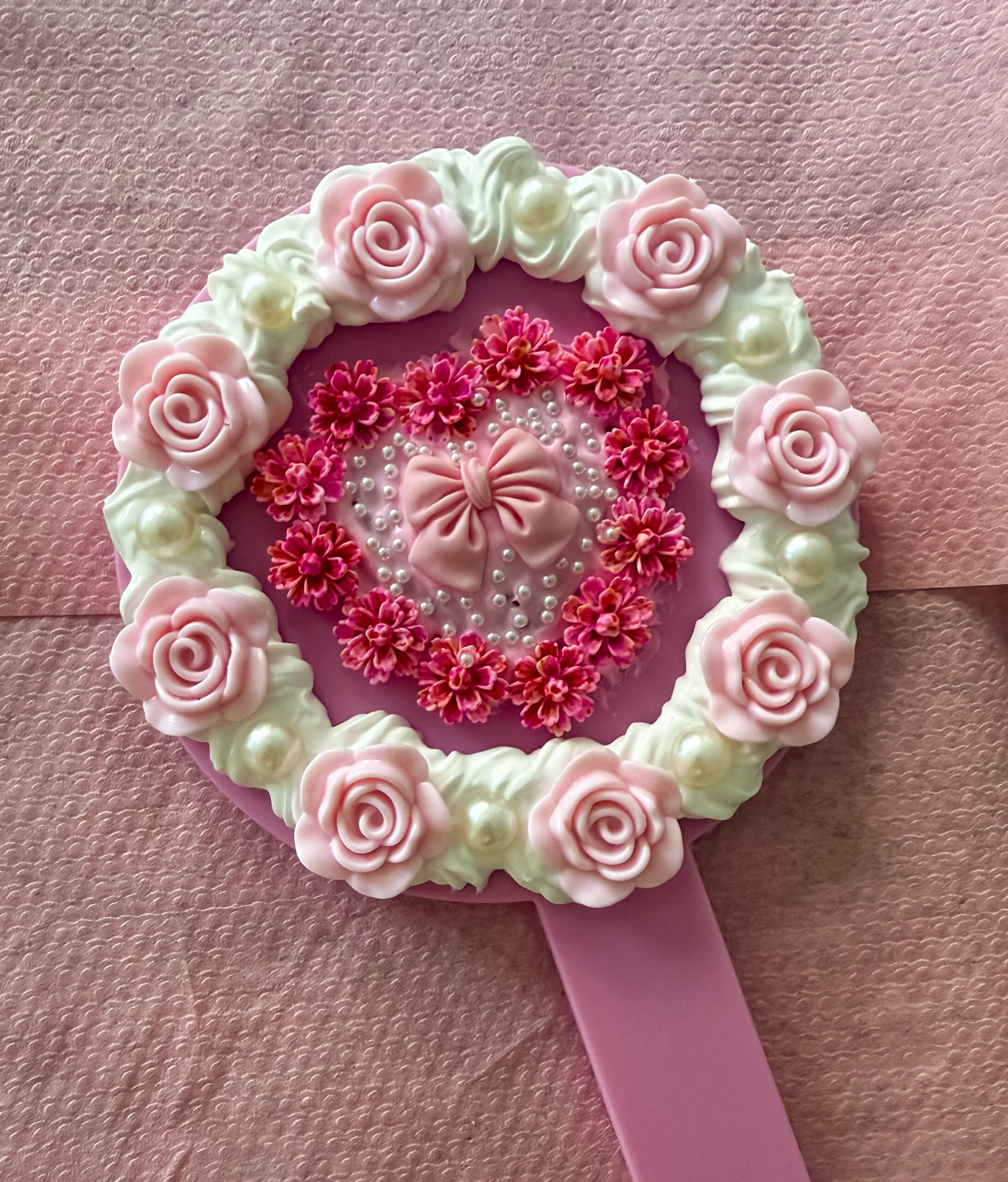Här ser ni resultatet och tycker att den blev riktigt söt. I mitten spritsade jag på rosa krämlim för att få hjärtat i den färgen. Sedan dekorerade jag med små blommor runt hjärtat och en rosett i mitten med små vita pärlor runt omkring. Längst kanten spritsade jag på vit krämlim och satte dit varannan blomma och varannan vit pärla.