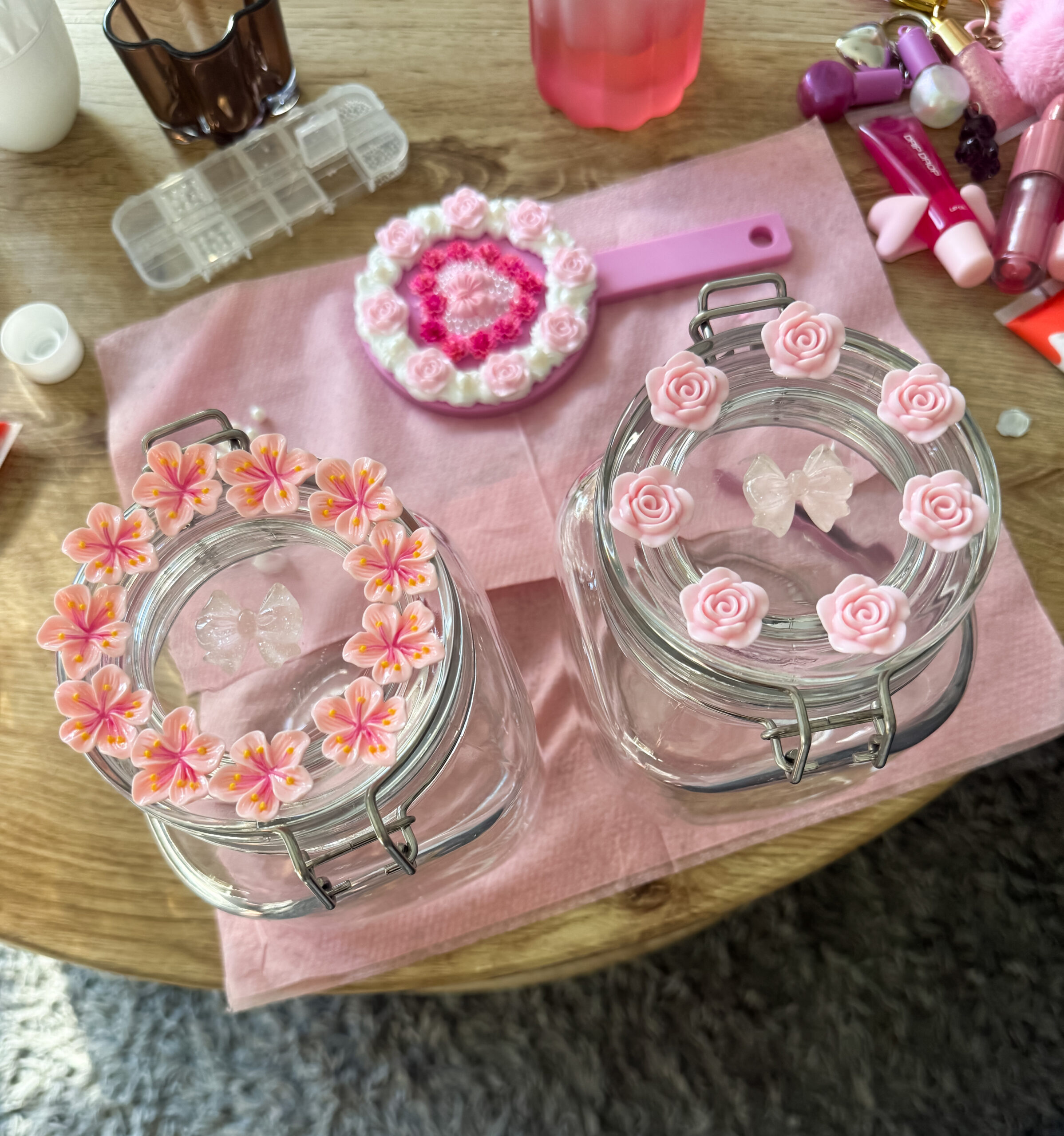 Har också haft ett projekt till med att dekorera locken på två glasburkar men ni får se resultatet i ett annat inlägg. På bilden nedanför ser ni när jag testar på med olika pärlor innan jag bestämmer mig.