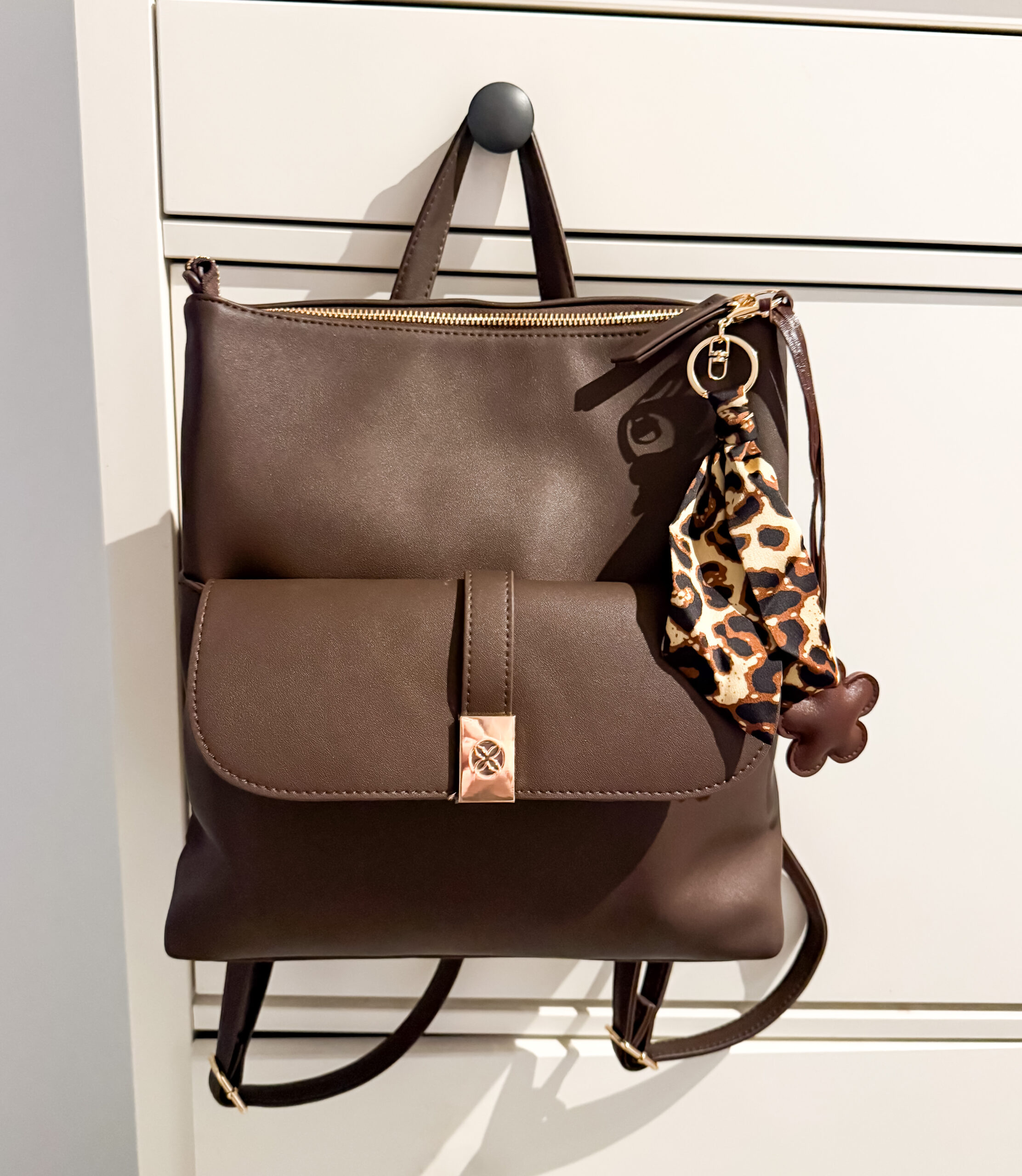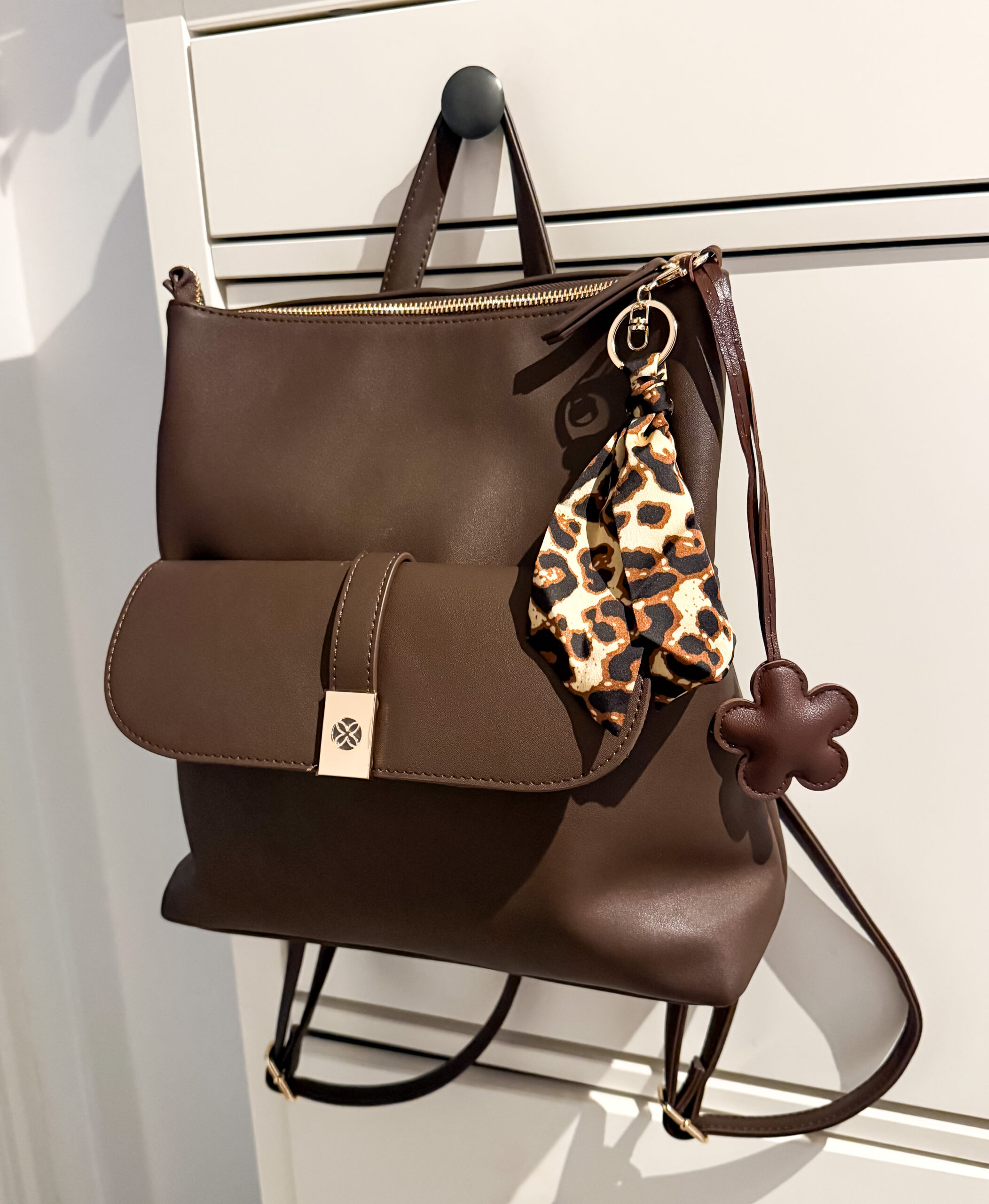 Jag tycker att det är så snyggt med väskdekorationer som matchar väskan. Har en mörkbrun ryggsäck i elegant stil och piffar upp den med några väskdekorationer. Just nu är brunt min favoritfärg när det gäller kläder, skor och accessoarer.